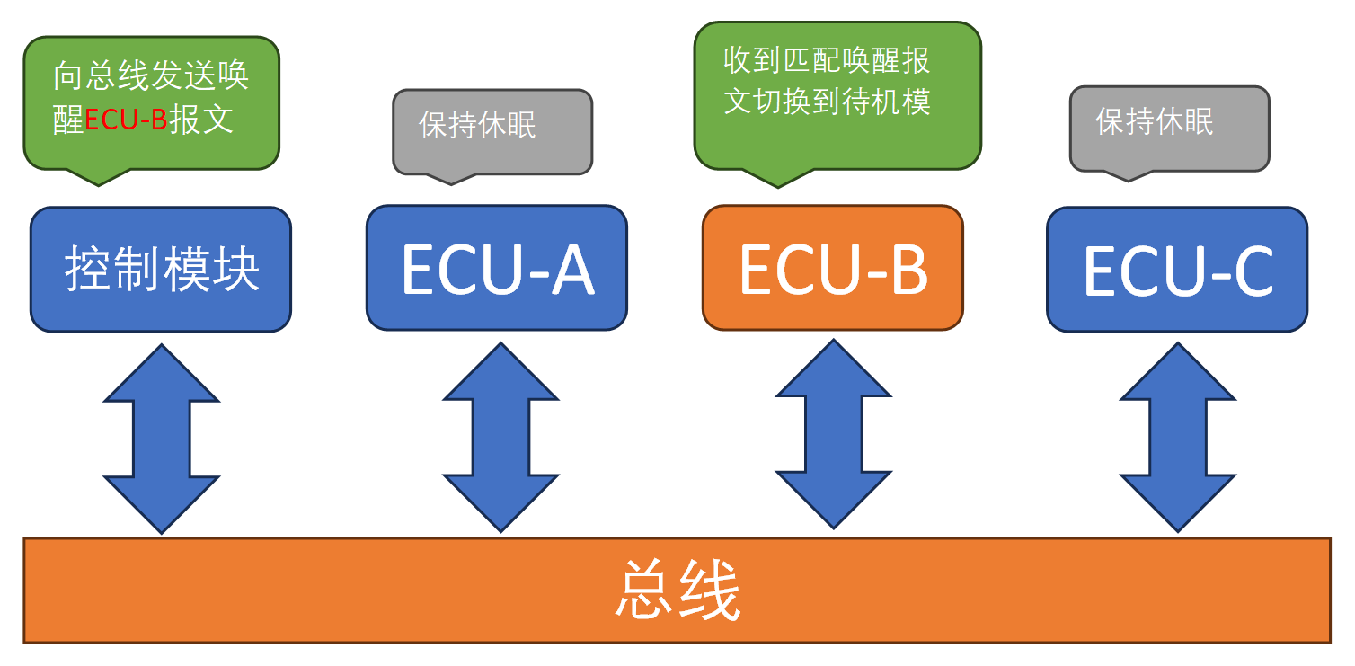 特定幀喚醒也叫選擇性喚醒和指定幀喚醒,是一種更高效的喚醒方法,它利用了CAN協(xié)議中的“遠(yuǎn)程幀(Remote Frame)”特性。在CAN特定幀喚醒中,一個喚醒節(jié)點會發(fā)送一個遠(yuǎn)程幀,以喚醒睡眠節(jié)點。而睡眠節(jié)點則被配置為只監(jiān)聽特定的遠(yuǎn)程幀,而不監(jiān)聽其他數(shù)據(jù)幀。當(dāng)睡眠節(jié)點接收到特定的遠(yuǎn)程幀時,它會立即從睡眠模式中喚醒,并啟動正常的通信操作。這種方法可以減小節(jié)點的功耗和總線負(fù)載,因為節(jié)點只需要監(jiān)聽特定的遠(yuǎn)程幀。相較于傳統(tǒng)的喚醒方式,CAN特定幀喚醒能夠更高效地從睡眠模式中喚醒節(jié)點,并降低系統(tǒng)的功耗和總線負(fù)載。而SIT1145AQ就是對這種特定幀喚醒方式進(jìn)行設(shè)計的。MCU通過SPI接口來設(shè)置SIT1145AQ的寄存器,設(shè)定喚醒ID和數(shù)據(jù)的范圍,并通過SPI配置進(jìn)入休眠模式,從而實現(xiàn)特定幀喚醒功能。如圖7, ECU-A向總線發(fā)送喚醒ECU-B 的特定報文,ECU-B接收到特定的報文后喚醒,其它ECU 保持睡眠。