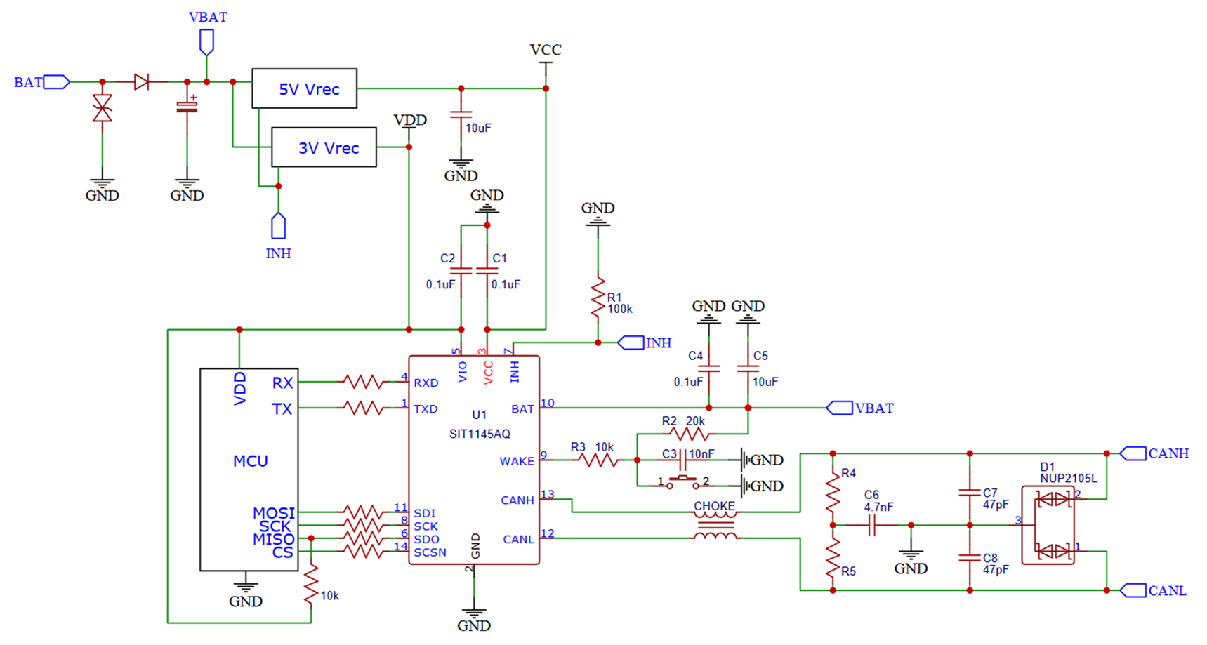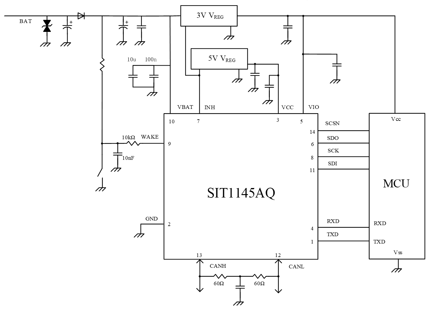 SIT1145AQ與MCU的SPI、TXD和RXD進(jìn)行連接,SIT1145AQ的VIO與MCU的VCC進(jìn)行連接,INH引腳用于控制3V/5V電源輸出使能。