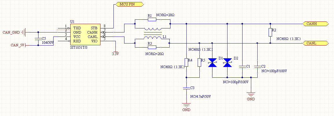 CANH 和 CANL 輸出到 GND 的一對匹配電容用于提高抗電磁干擾的性能。相應(yīng)噪聲源的阻抗和 CANH 和 CANL 對地的電容組成了一個 RC 低通濾波器。電容值必須由節(jié)點的數(shù)量和數(shù)據(jù)傳輸頻率決定。一般選取<100pF,如果外接 ESD 保護器件,該電容值可適當減小或省掉。圖中串聯(lián)電阻可調(diào)整與對地電容形成的低通濾波器性能,但電阻值不應(yīng)過大,導致顯性差分電壓值降低明顯。
